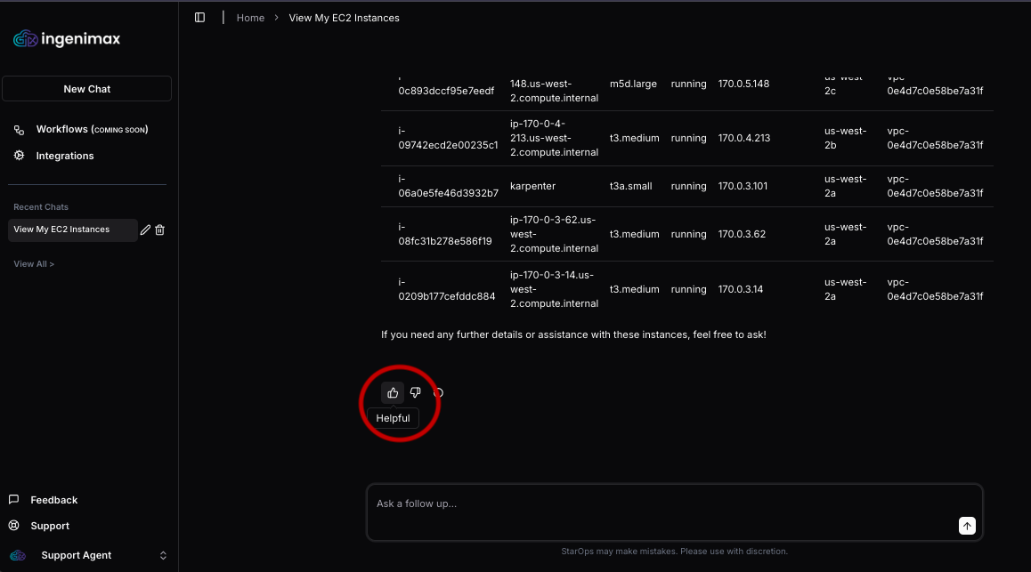 Use the in product feedback feature found just below your response in a chat window. Feedback can be good (thumbs up) or bad (thumbs down). If you select bad, StarOps will prompt you for further information on your feedback.