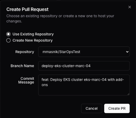 Once StarOps has deployed your model and any dependencies, you can also open a pull request to your organization’s GitHub.