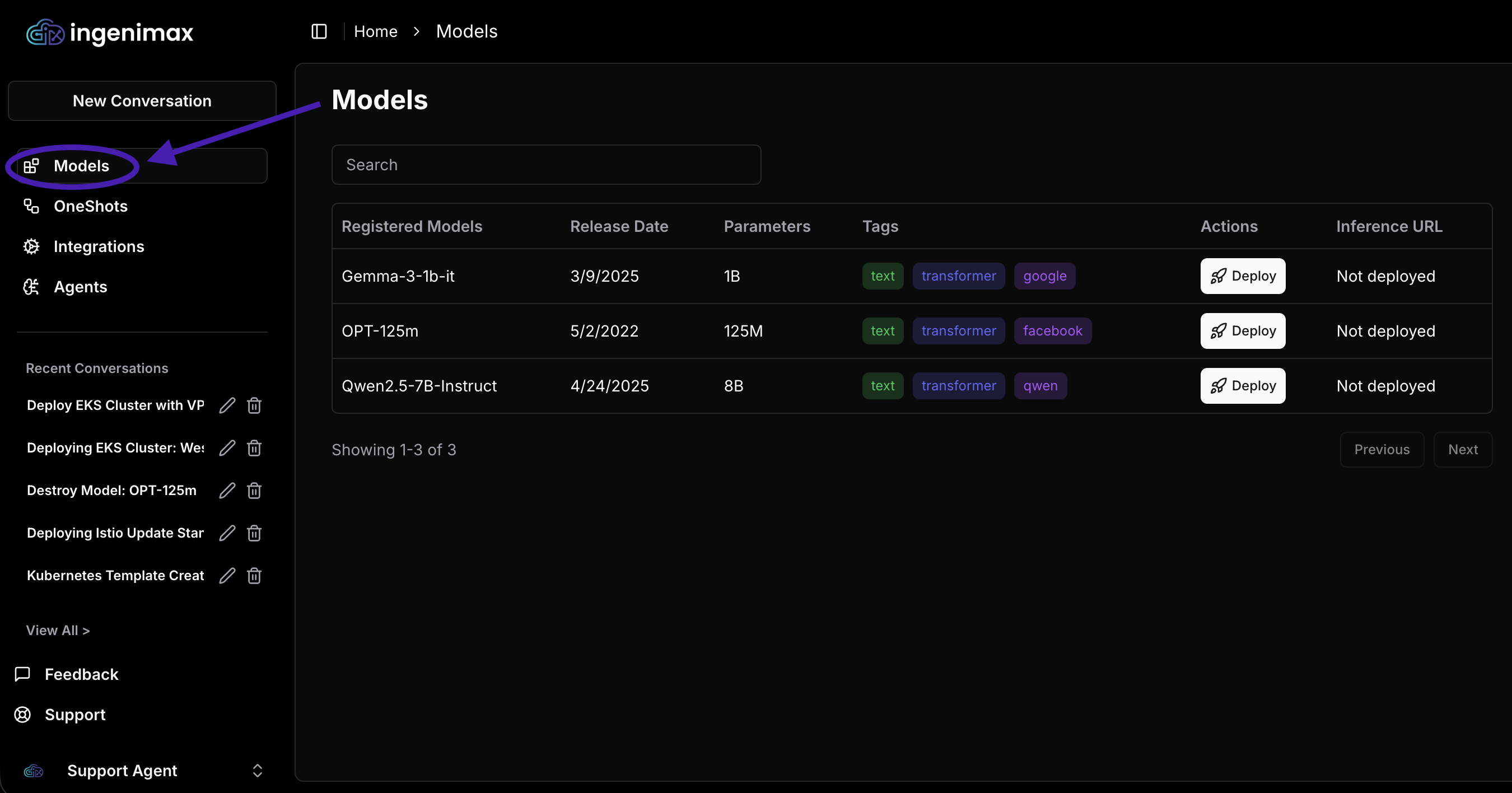 StarOps provides a concise Models page where you can access and deploy models available or access previously deployed inference models.